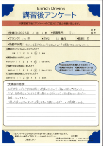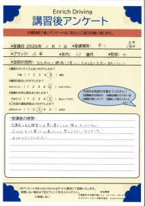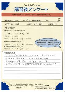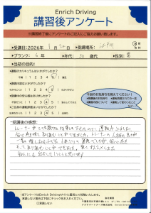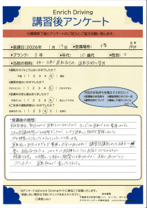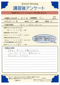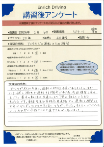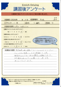 免許取得以来の運転でゼロベースからのスタートでしたが,わかりやすく指導していただき感謝しています。練習あるのみですが,本日の講習は理解できました。また機会がありましたらお願いしたいと思います。ありがとうございました。