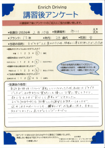 約5年のブランクがありましたが,事前にテキストをお送りいただけたことで予習した状態で運転に臨めました。ただ,テキストと実際は異なることもあり,特に駐車は苦戦しました。繰り返し練習しようかと思います。